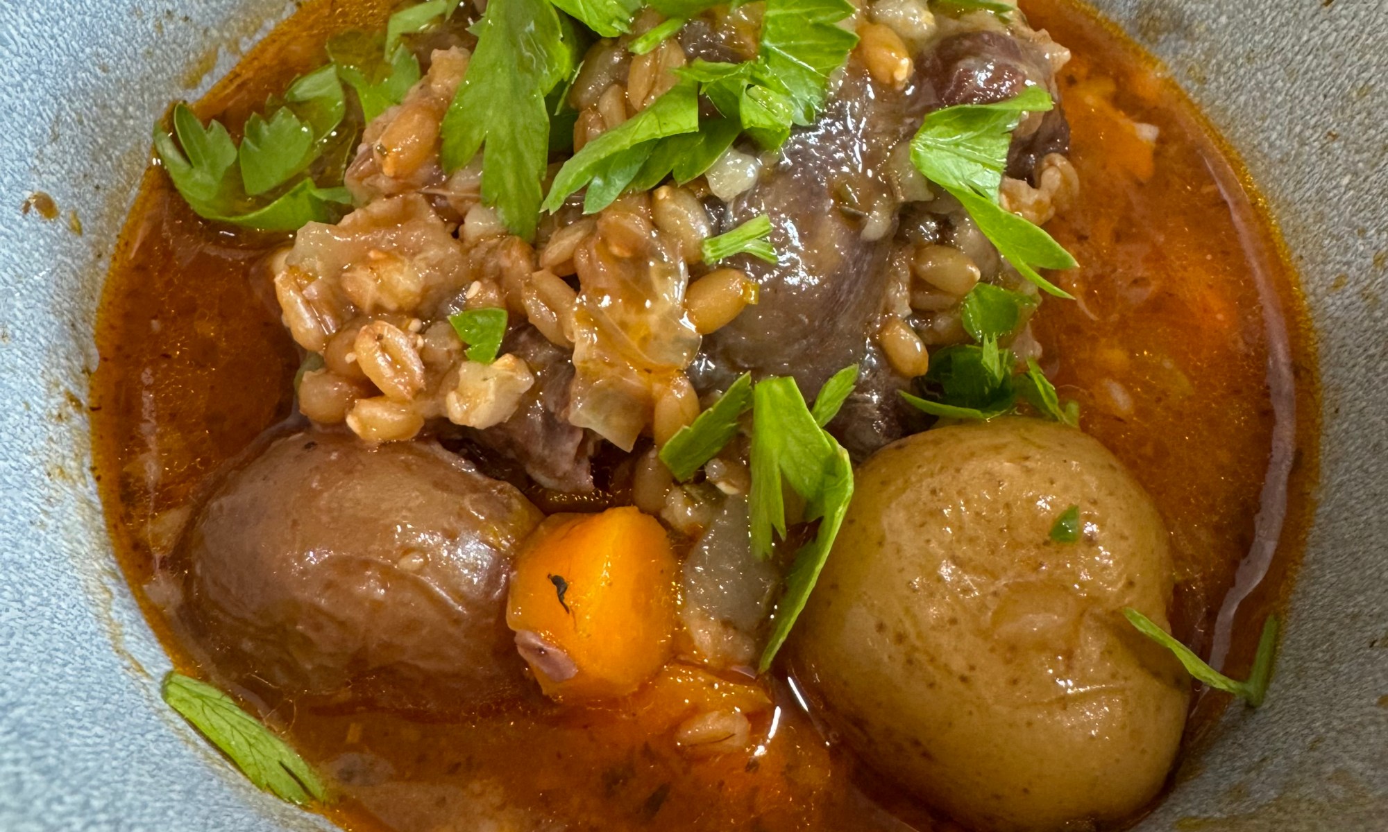 Ingredients: 2 lbs oxtail 1 cup golden oyster mushrooms, sliced 3 large carrots, peeled and chopped 2 large onions, diced 3 celery stalks, chopped 12 small whole baby potatoes, unpeeled 2 cups patty pan squash, chopped 1 cup farro, rinsed 4 cups beef broth 2 cups water 2 tbsp Worcestershire sauce 2 tbsp Bragg Liquid …